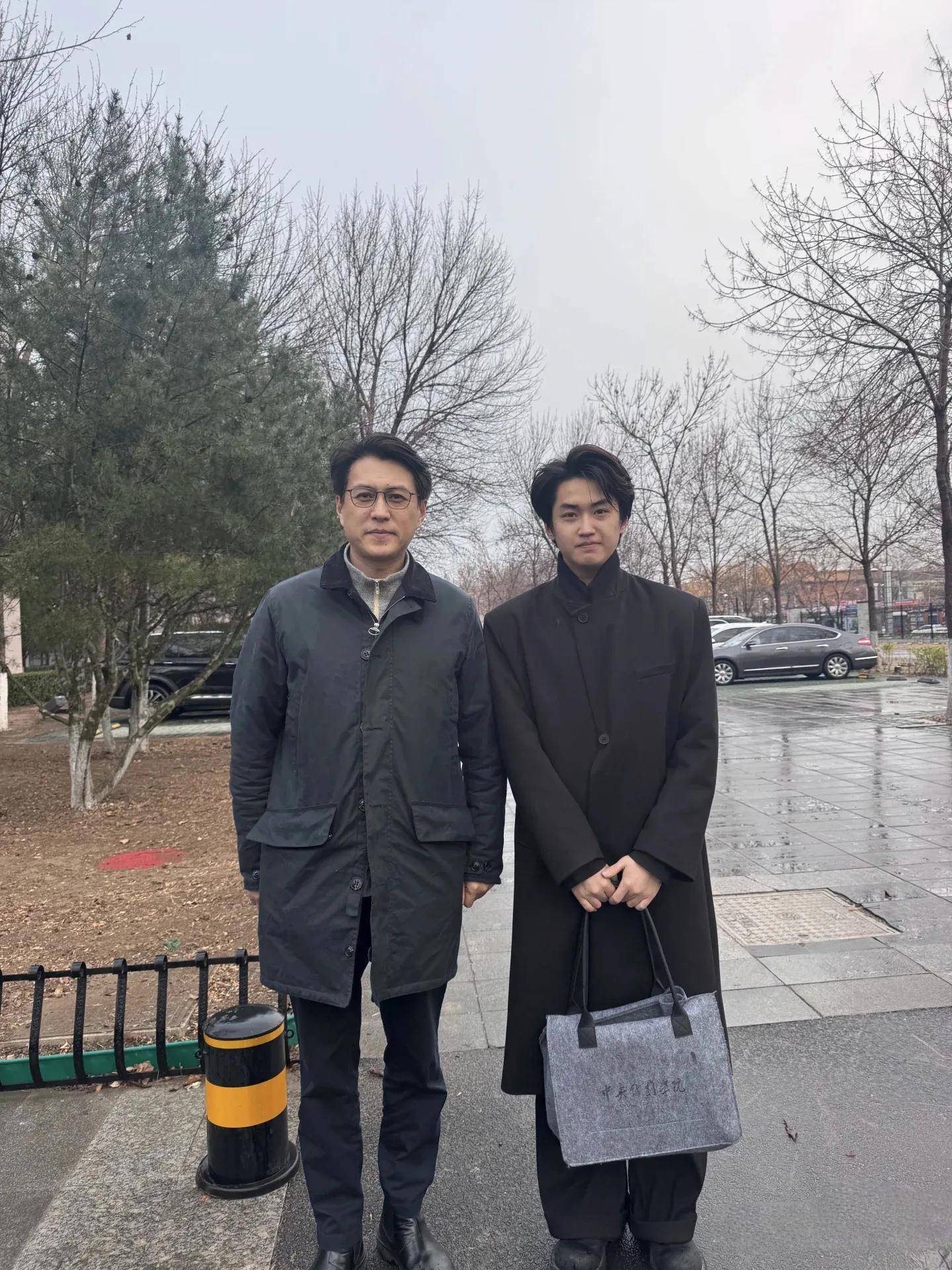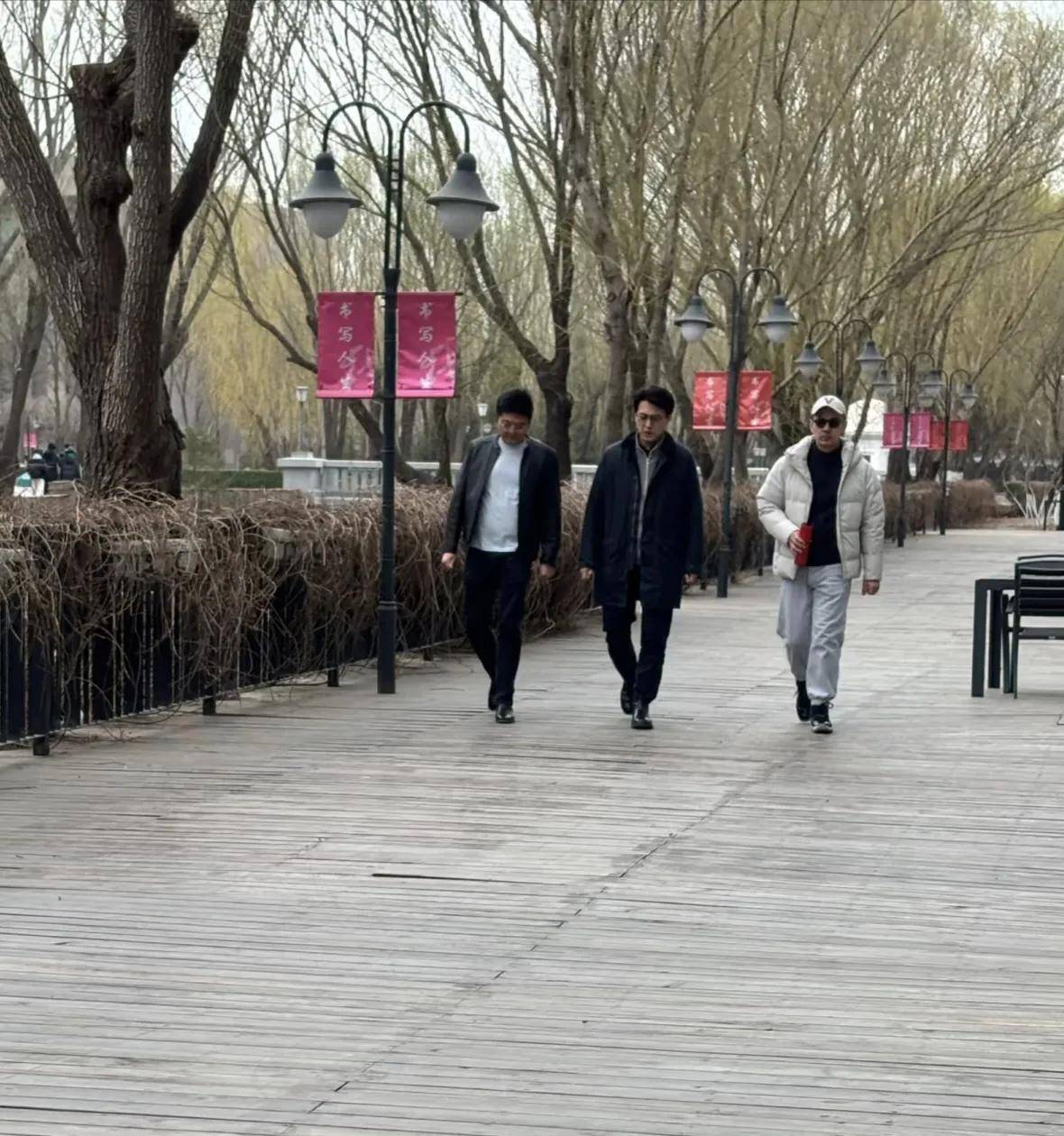 他出现在学校里,身边有两个人陪同,不知是他身边的工作人员,还是他的同学,三个大叔并排走在校道上,非常霸气,好像在拍电视剧一样!